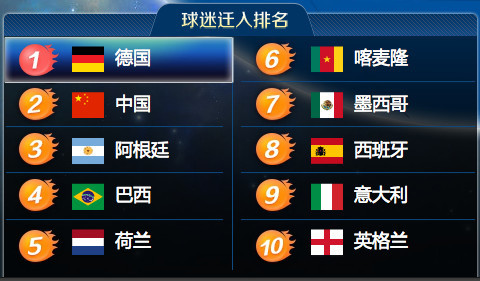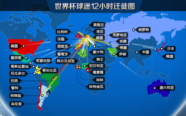 世界杯激战正酣,即将进入最高潮,大部分人支持的球队都已经淘汰出局,只剩下进入最后决赛的两只。不过对于伪球迷来说,随时变换喜欢的队伍,也是一件十分容易的事。微博推出了世界杯球迷 12 小时迁徙图,有趣的展现了球迷们的喜好动向。 在世界杯期间,微博推出了添加国家队标签的活动,将喜爱的球队国旗添加在名字后面。随着比赛的推进,球迷们不断的变换着支持的队伍,越来越多的球队被淘汰出局,许多球迷将已出局的球队更换成未出局的球队,在这份迁徙表中,有不少有趣的数据。 数据分为“迁入”和“迁出”两种,迁入表示获得了别的国家的球迷,比如这块排名第一的是德国,这很好理解,因为德国在过去几天的表现相当抢眼。有趣的是迁入德国的球迷来源,排名第一的居然是巴西,也就是说,德国狠狠赢了巴西之后,大量巴西球迷转为德国球迷。 排名第二至第四分别为中国、阿根廷、巴西以及荷兰,中国队进入并不意外,阿根廷是另一只决赛球队。不过奇怪的是,在整个榜单中,除德国外剩余 9 只球队中有 7 只球队的球迷第一来源居然是德国,可见有多少人爱就有多少人恨。 球迷迁出榜单里面,中国勇登榜首,德国与阿根廷分列二三。有意思的是,德国、阿根廷的球迷大量互相反水,双方均有大约三分之一的球迷跑到对方阵营,均占据对方迁出帮榜首。而在迁出榜中,除德国外剩余 9 只球队中,有 7 只球队的球迷逃离时第一选择都是德国,造就了德国迁入榜首的位置。 不出意外的话,明天夺冠的球队将会占据迁入榜榜首,其他球队将与中国继续争夺迁出榜榜首。 这份图表最有意思的莫过于球迷对德国的态度,一方面绝佳的表现吸引了最高的关注度,同时又有最多的拥趸叛逃。人们放佛更喜欢内马尔、梅西这种极具光环的英雄人物,而不是整体足球的清汤寡水。 徐州蝌蚪http://kedou.cnxz58.com |